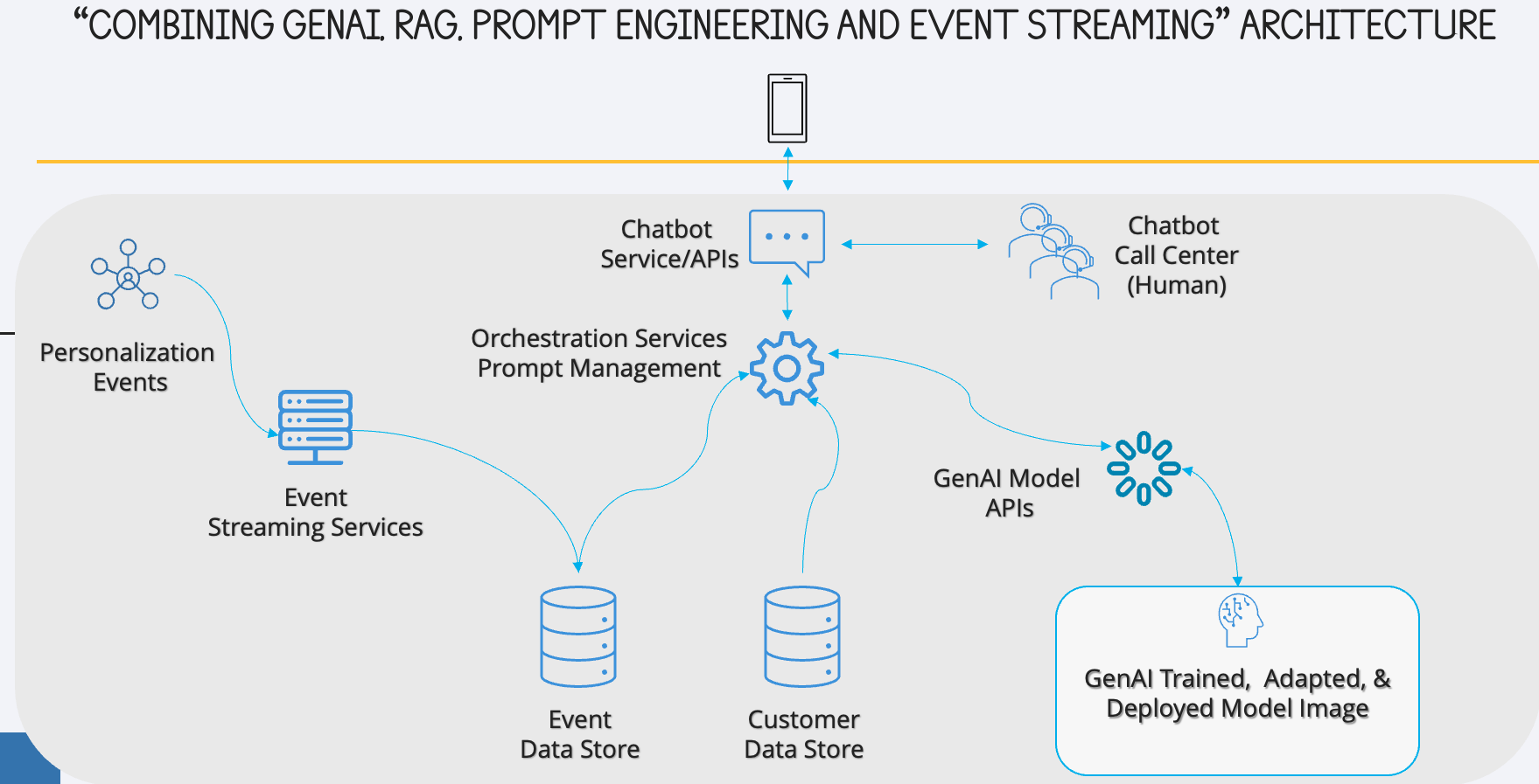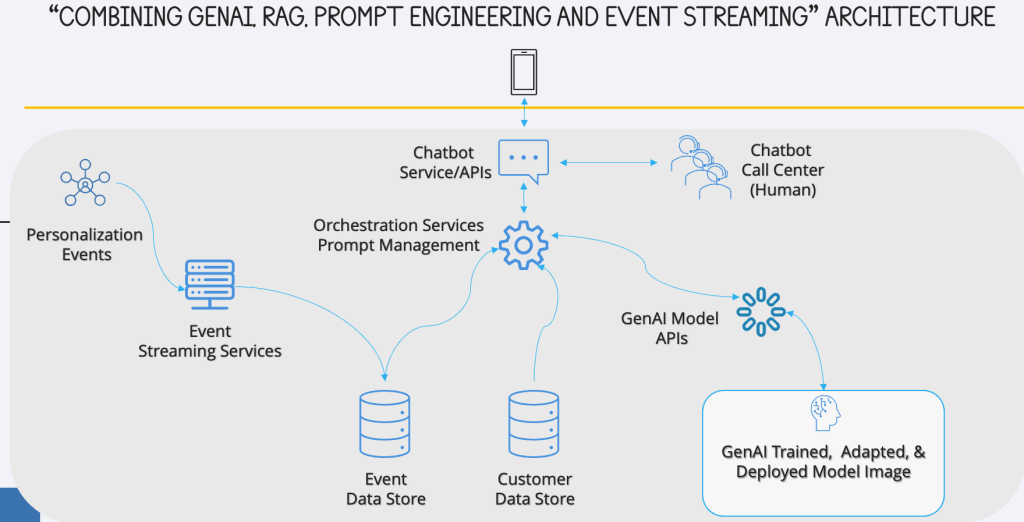 To illustrate the power of combining GenAI, RAG, prompt engineering, and event streaming, let’s consider a practical chatbot use case. In this scenario, a banking chatbot is designed to assist customers whose credit cards have been locked due to predictive fraud detection. The chatbot leverages real-time data and RAG to provide relevant and timely assistance, improving the customer experience and reducing the cost of human interaction.